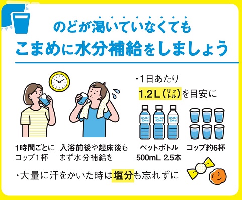 高齢者の方は自分で暑さや喉の渇きに気づきにくいうえ、体調の変化も我慢をしてしまうことがあります。
